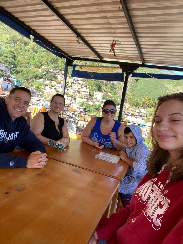 i’m writing this while sitting in a hammock on our balcony, over looking the lake and two volcanoes. today is our first official day in guatemala. yesterday was crazy busy. dad and i woke up at 3am to catch our 5 o’clock flight to fort lauderdale. all i remember from the airport is the man attempting to bring a chainsaw on the plane. since it was so early, i slept through the entire flight. we arrived in florida around 9am and waited for our 10:30 flight. once on the second plane, dad opened his yogurt parfait and spilled all of his granola on the ground. safe to say we behaved extra well for the remainder of the flight. our plane landed in guatemala city around 11am (with the time change). once we got through customs, which was a breeze, we met up with sergio, our driver. the van ride was pretty long. since we were driving over many mountains, it was mostly made up of twists and turns. we made it to lago de atitlan at 2:30pm. from there, all that was left was a boat ride. the water was really choppy, so the hard, plastic benches, were not enough to comfort our behinds. dad and i arrived at the hotel at about 3:20. we got settled in our room before heading out to meet up with nicole, luca, and michele. we found them down the beach at a woman’s house where aunt michele was getting a massage. after that we hung around the hotel for a few hours while we waited for dinner. dinner was a delicious barbecue. we ate and ate until our stomachs were stuffed, and played cards well into the night. after that, luca and i played a game of pool before heading up to bed. i woke up to the sound of birds chirping and the waves splashing, which is an awesome way to wake up. now we are just hanging out before heading up to breakfast. i can’t wait to see what today holds.