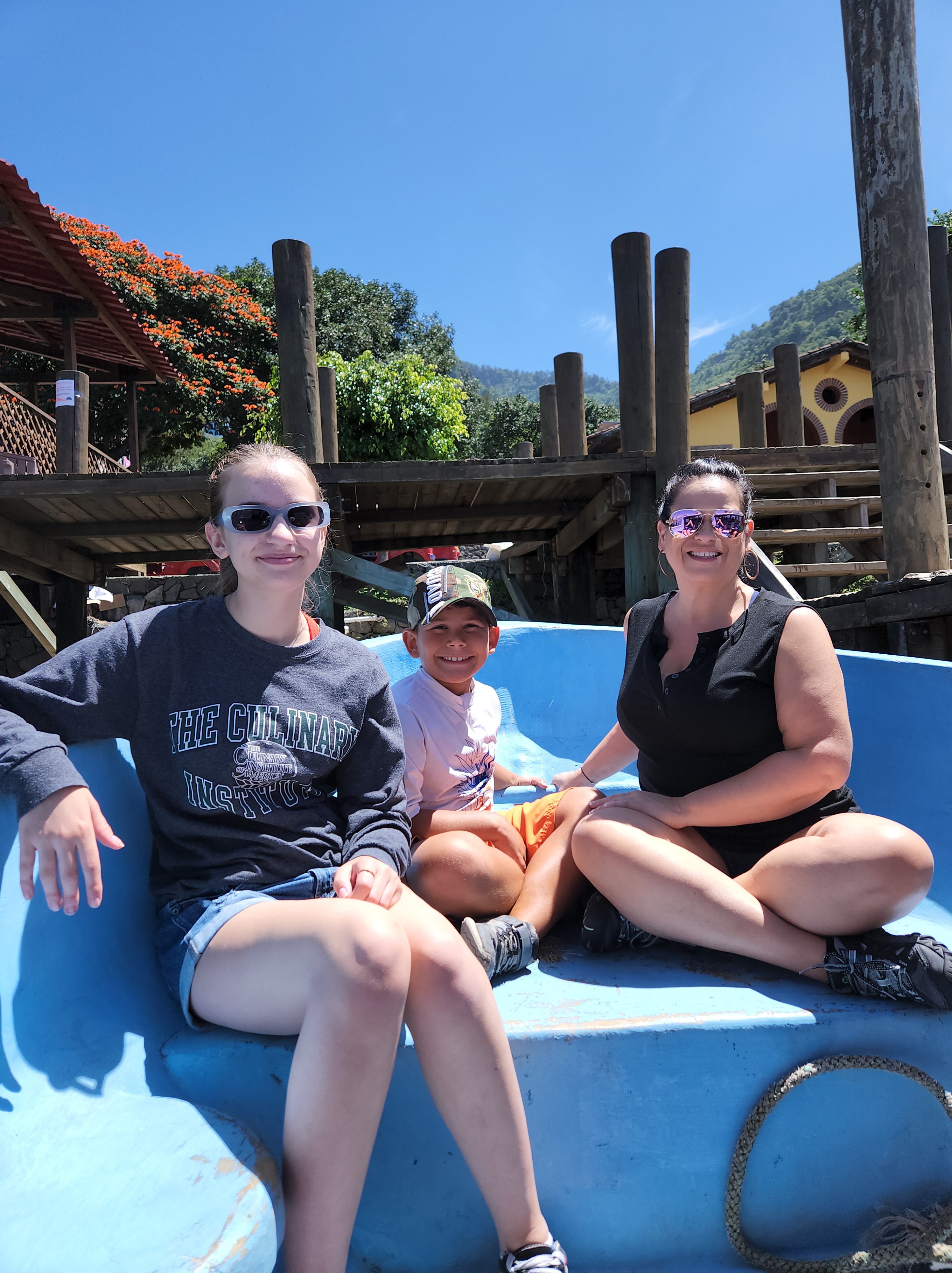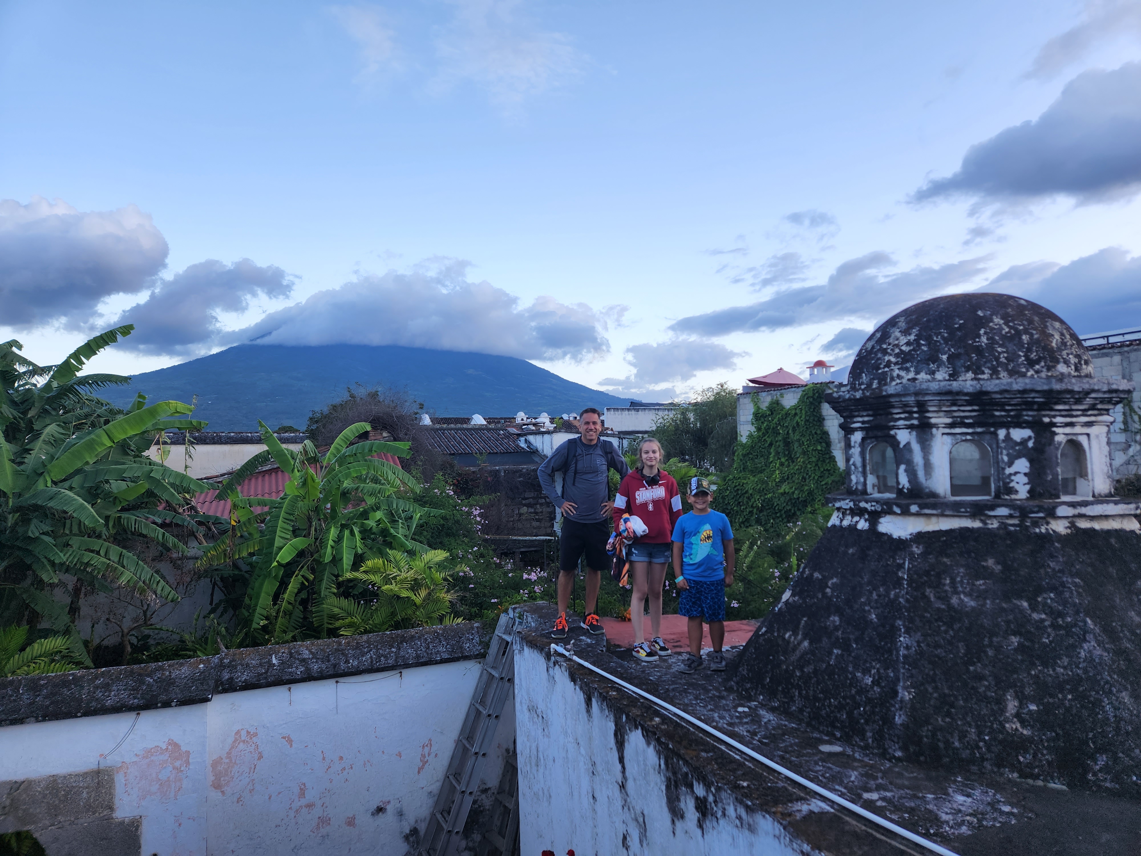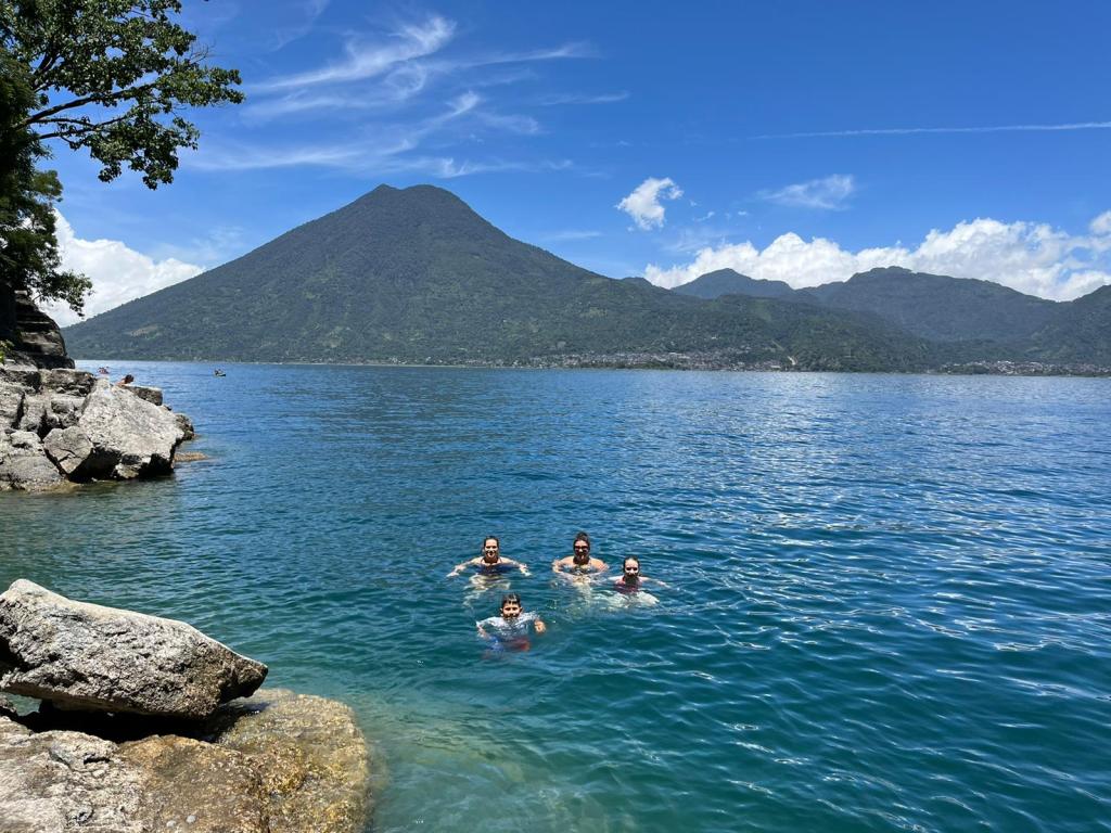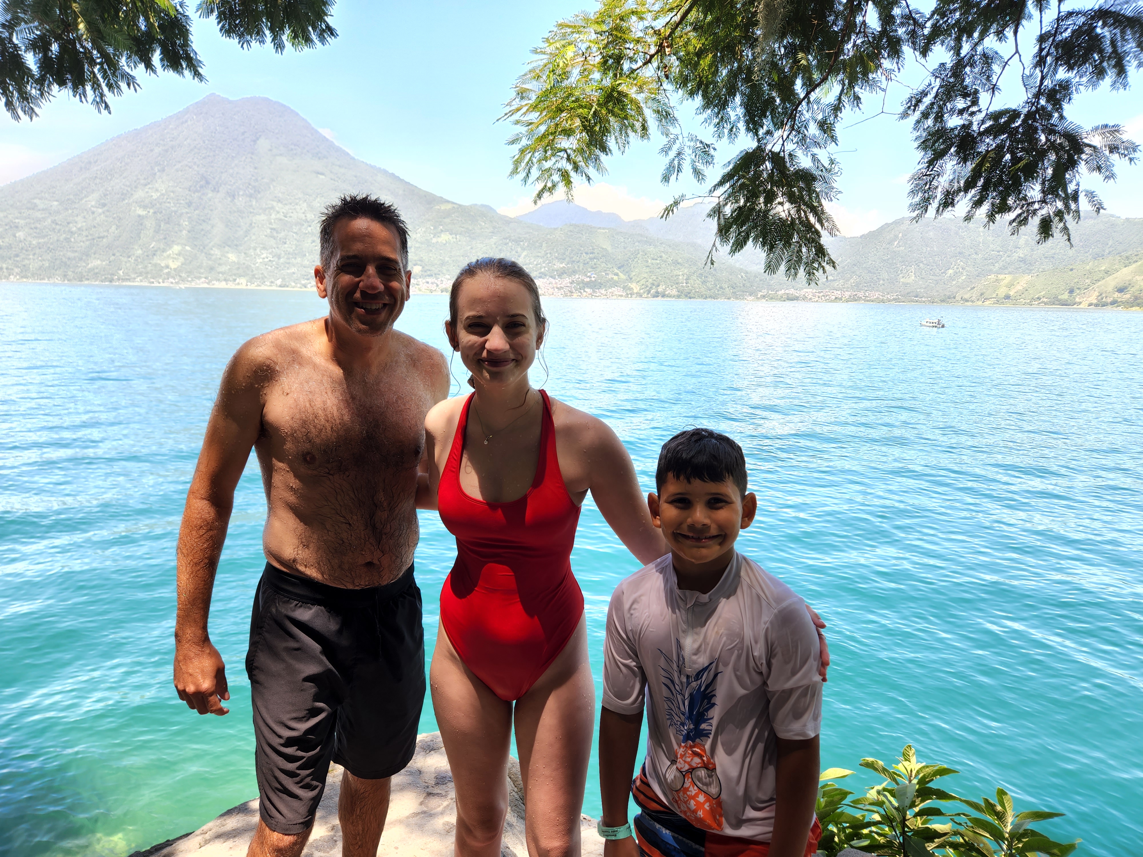 Luca writes…..I slept until 7:15am. We woke up and took a tuk tuk to breakfast. Then I did word puzzles. Then we took a tuk tuk back to our hostel and packed up our bags and took a boat ride. The boat driver was so crazy that the boat flew in the air. Tía, me and Maggie went on the front of the boat. We took the boat to San Marcos where there was a 40ft jump into the volcanic lake that was made 84,000 years by the volcanoes around it. We went on the path until we got to a big rock. I first jumped off a lower rock then I jumped off the big rock. It was cold in the lake and in the air when I got out of the lake. I was excited and a little bit nervous before I jumped. It felt like “I believe I can fly” when I was in the air. It was so fun. I felt brave. After we jumped we swam to the other side, but we had to take 2 or 3 breaks because our arms were tired. We swam over to meet mommy and Tia who didn’t jump because they thought it was scary so they just slid on their butts into the cold lake. After we dried off, I was so dry I didn’t get one single drop on me. Then we walked to the boat and took it back to Santa Cruz because we had to get our stuff from in the hostel. The ride back was super rough and people were brave. We ate lunch and then I was waiting to play pool before we left but other people took two turns and I didn’t get to play before we had to leave to go meet Mr. Sergio. We took another boat to Pana. Mr. Sergio picked us up at 3:51pm and then we took a 2 hour drive. Then when we got there we had the largest house I could ever think of. Even there were stairs that goes to the roof. Tia asked me if this was a cool house, but i said “it was the best house I could ever think of.” But a grown up has to be with me for sure when I go on the roof. I can see the beautiful view of the volcanos and people’s yard from the roof. There are 3 gardens. There is even a Spanish school I go to.