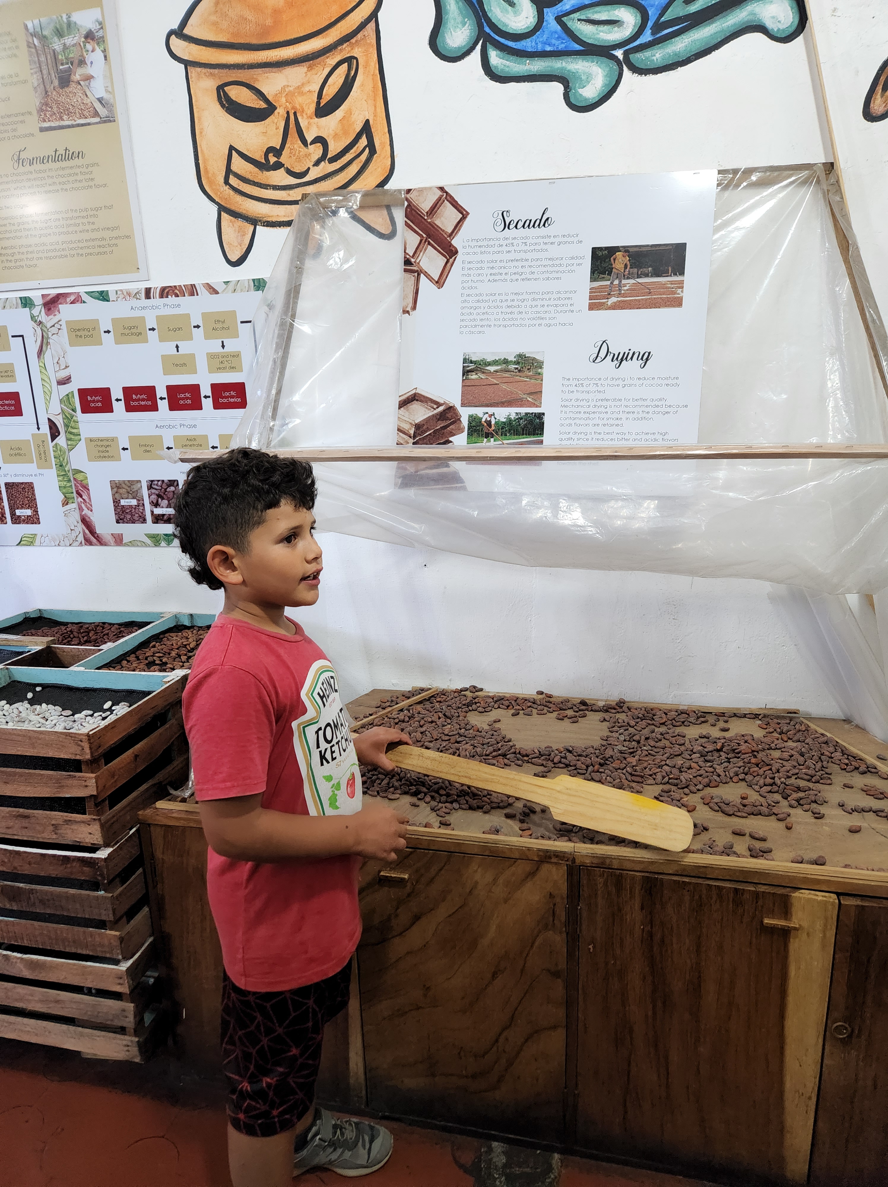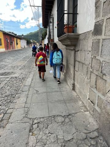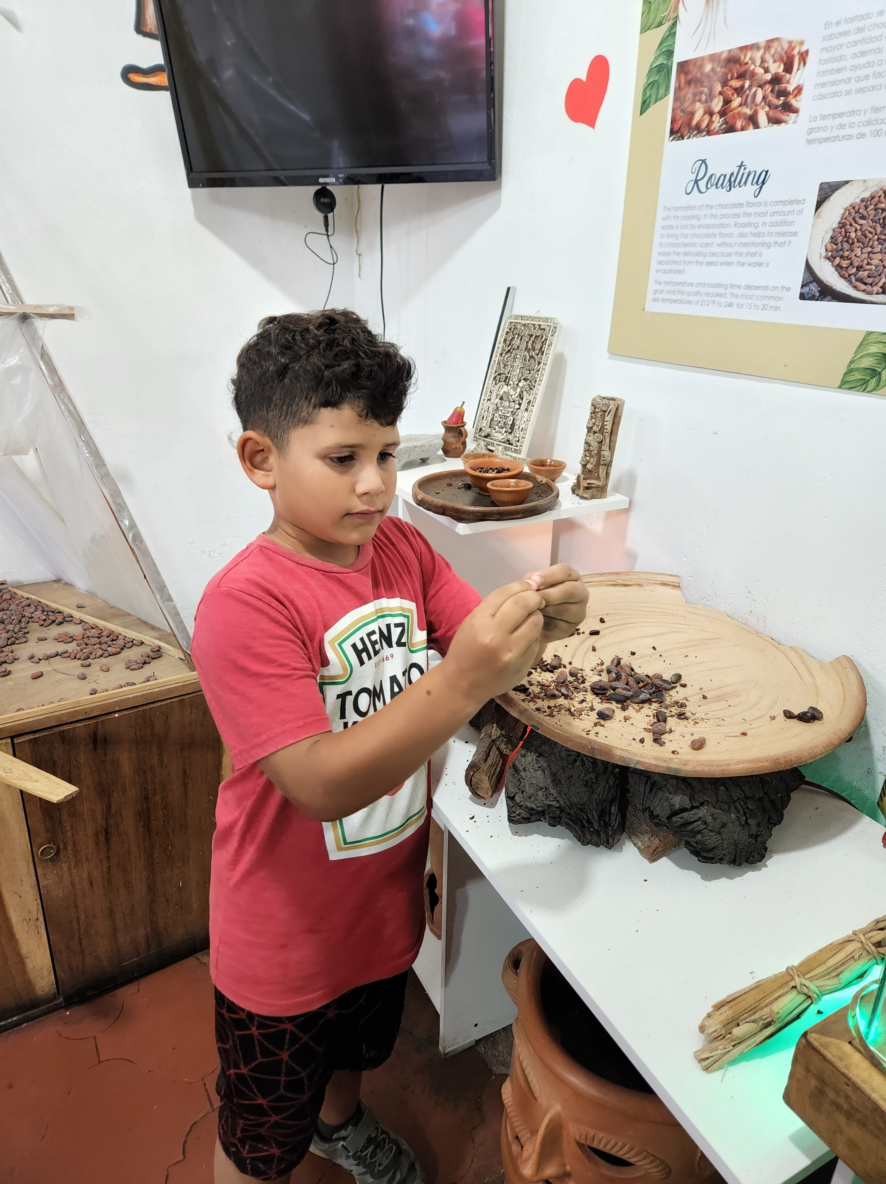 Luca writes…I slept until 7:15am. Then we got ready for Spanish class. Then we walked to a new Spanish class at a different place and it was bigger. They had a roof above or desk in case it rained. It did rain and we got wet because we sat at the picnic table with an umbrella. All of the teachers, Maggie, Tia and me were playing games. We played a game with opposites in Spanish. I won the first game, and Maggie won the second game. Nobody won for the teachers because it started raining and all the cards flew away, luckily we didn’t lose them. Then we walked back to our house and ate lunch. I tried a sandwich that Tia gave me with fried salami, eggs, and bread. It was a little bit good. Then we took a tuk tuk to see the city from above. Then we walked through the slippery dirt and took the same tuk tuk as last time to the chocolate museum. I tried chocolate and it was good. I peeled the chocolate beans. Then I tried an empanada (it’s a piece if bread with beef inside of it) and it was a little bit good. Then we went to Tacool (taco place) with Maggie and Michael-John. And then we ate steak, pork, and steak with guacamole (i ate the food like a chomping machine) Then we walked back to our house, and I took a shower. Then we watched the fire that Michael- John made in the sala. The smoke came through the chimney. The fire went out. That’s our blog.