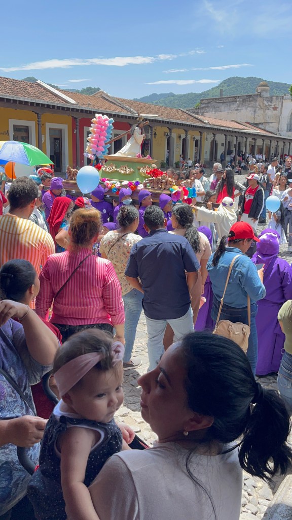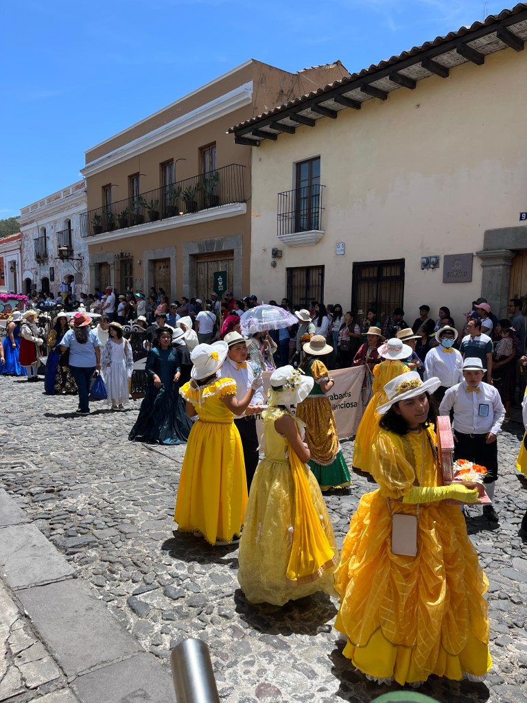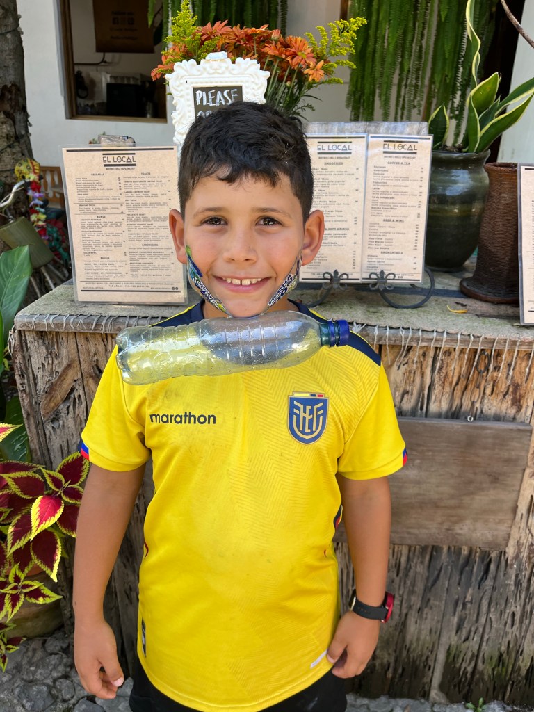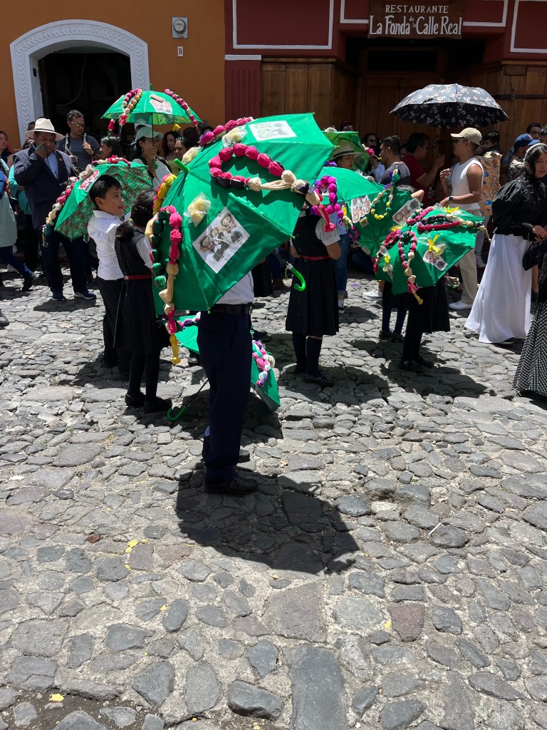 We woke up and did our normal morning routine. I learned some more. I sang a lot. Mommy met us at the pausa for a field trip. We went to the parque (park) to watch the festival/parade. They were celebrating Saint Santiago. There were a lot of people playing instruments, wearing their own hats and dresses and costumes, and there were only a few cars because there were so many people. It was muy interesante (very interesting). The drums and trumpets were my favorite part. I also liked seeing all of the little and big kids participating in the parade. That was cool. We went to eat lunch in a really cool garden. I put on a bottle wrapper attached to a bottle on my chin like a beard. We went home and I FaceTimed with my cousin Ady. Then we played monkey in the middle and after, I found a blind snake! I ate my favorite thing for dinner; spaghetti. I did my normal night routine. This is a short blog because it’s late. That’s my blog.
