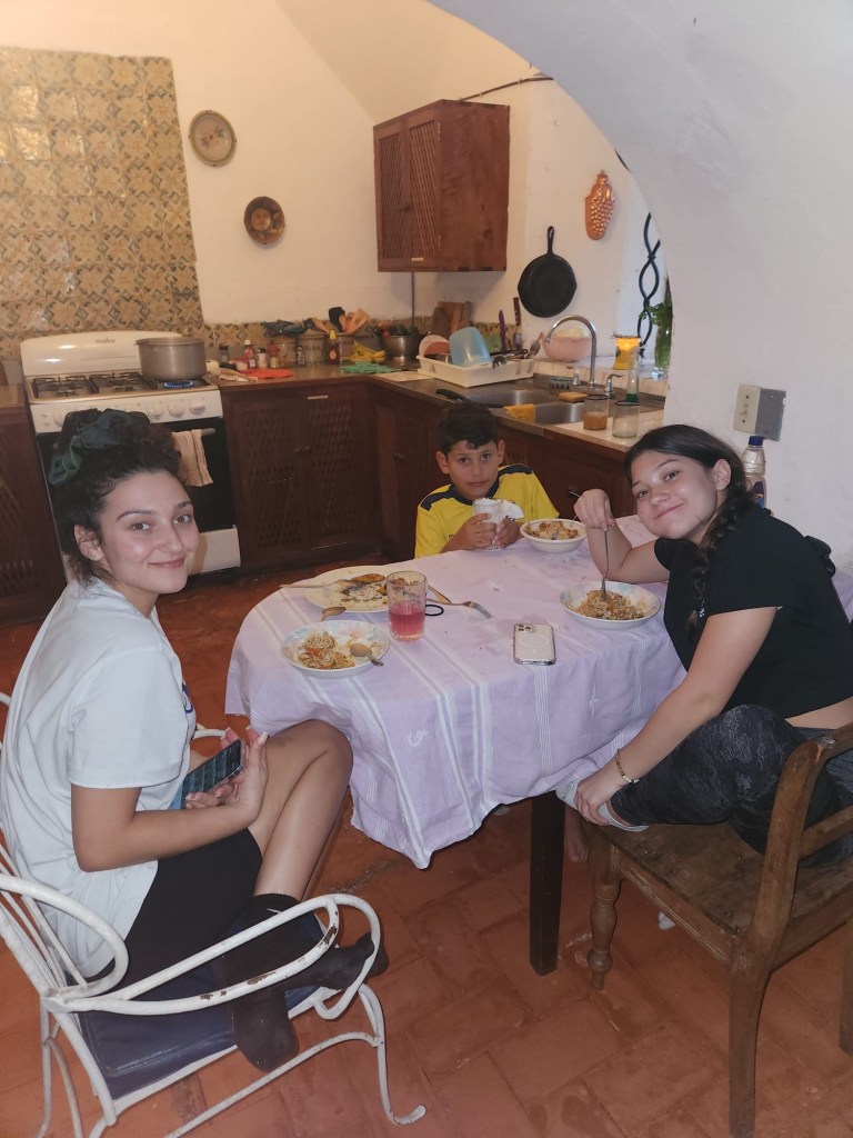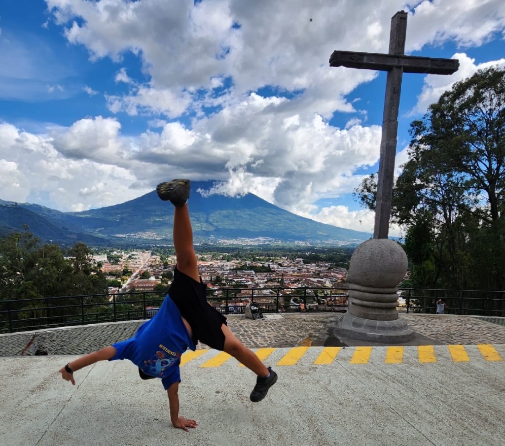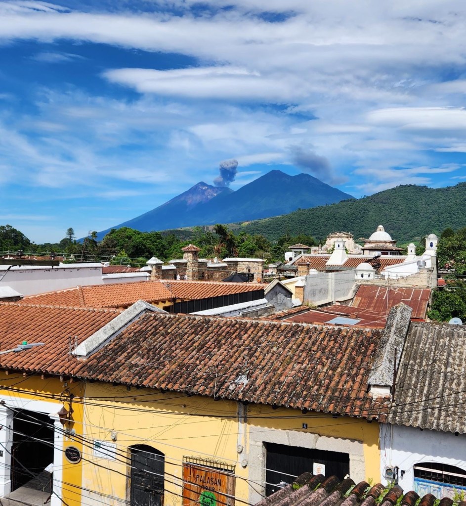 Monday we woke up did our normal routine. Then we walked to school, we sat in a different room today. I like it. Me gusta (which means, I like it). I learned today but I didn’t write it in my book so I don’t remember anything. Then I had pausa (break) and we went to this cool breakfast place even though it was not breakfast. It was on the roof and we saw the volcano erupting. It was so cool.