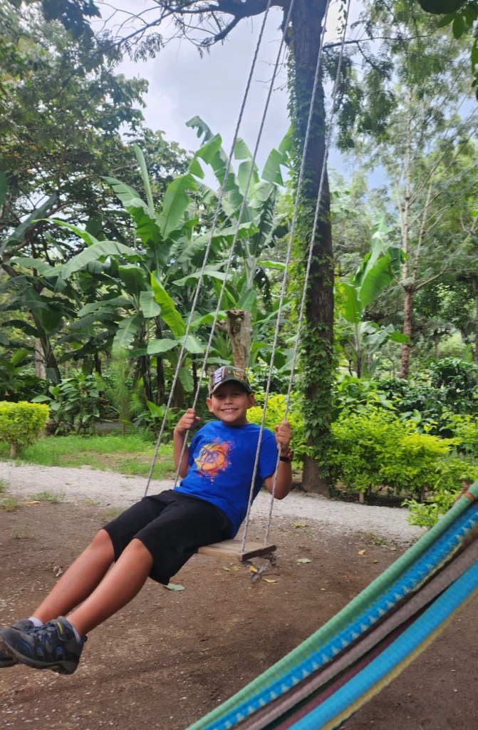 On Sunday, we woke up, we did our normal routine and we rested a little bit while Kayla and Kianna were sleeping. I went to the coffee farm and we ate outside. There was a hammock and a wooden swing. A little bit later something crazy happened on the swing, the swing slipped over and I was hanging upside down. I called my mommy to help me, I hanged on as long as I can and she saved me.