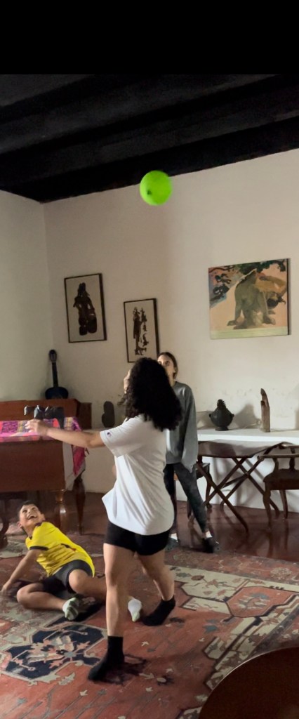 We went back to school, then I learned more. Then I listened to Bones in Spanish and in English. Then we brought scrabble letters and we wrote words in Spanish. I think we won by 4 points, I think. It was veinte y cinco to veinte y uno (25 to 21). Then school was over. I came home, ate lunch, I had three hot dogs and some papas fritas (which means French fries). Then after we relaxed, the girls went to a cafe. After they were done with the cafe we played keepy uppy with sitting instead of standing. We had to keep the balloon in the circle. Our record was cuarenta y seis I think (46). Then we went to cerro de la Cruz and took gymnastics pictures.