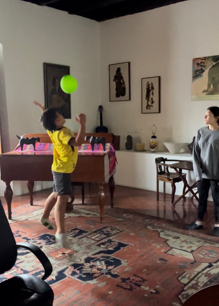 On Saturday, we woke up, did our morning routine, and it was raining a lot so we didn’t do anything. We played keepy uppy, which is where you have a balloon and it’s where you don’t let the balloon touch the ground. We have to only hit it one time and wherever the balloon goes we have to hit it. I found the balloon under the chair. It was a cool find.