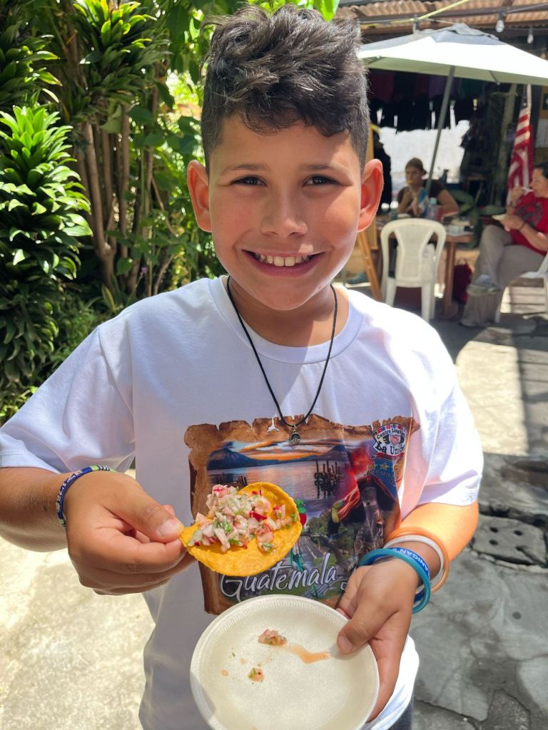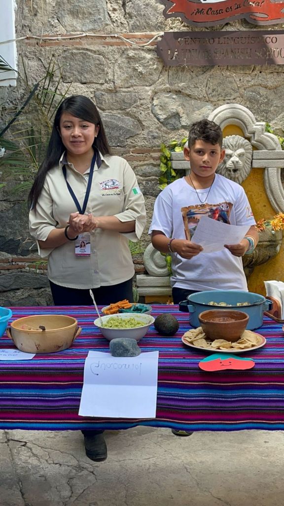 Today was the most important day of Spanish school. I had a presentation about chips and salsa. But first I woke up at 6:45am and had cereal for breakfast. We walked to school and first we learned about feelings first and then we had to make the salsa. It was a Guatemala’s salsa called Guatemalteca. We had to cook the tomatoes until the skin was black and soft. Once all the tomatoes were black and soft we crushed them into small pieces and then we did it again and again and again. The rest of the ingredients for the salsa was cilantro, red onion, and lime. Once it was all finished it looked so good to eat with the chips. Then it was time for the presentation. Everyone in our family participated but not Mommy because she already knows Spanish. I went first. My voice was super nervous and I was about to stop but I pushed through it and once I finished I was so happy I got it over with. Then it was Ms. Christine’s turn and hers was so funny 😂. Then it was Tia’s turn. For some reason all the adults had a lot of words to say and including Tia. She did super good and all of us did super good. When everyone went the most favorite thing of all that I loved was chips and radish salsa!!!! That was so good! Then I got back to learning in school and I played a bunch of games with my teacher. Once I was finished with school we walked home and ate lunch. Then we chilled and then at 4 o’clock we walked to salsa lessons and I brought my word search because it was too advanced for me. Once we finished we ate dinner at the most fanciest restaurant in town and we had the best view because we had a light show where the projector projected really good stuff on the ruins. I talked to grandma and she just wanted to say that I did good at the presentation. Then we walked home and took a shower and went straight to bed because I was so tired.