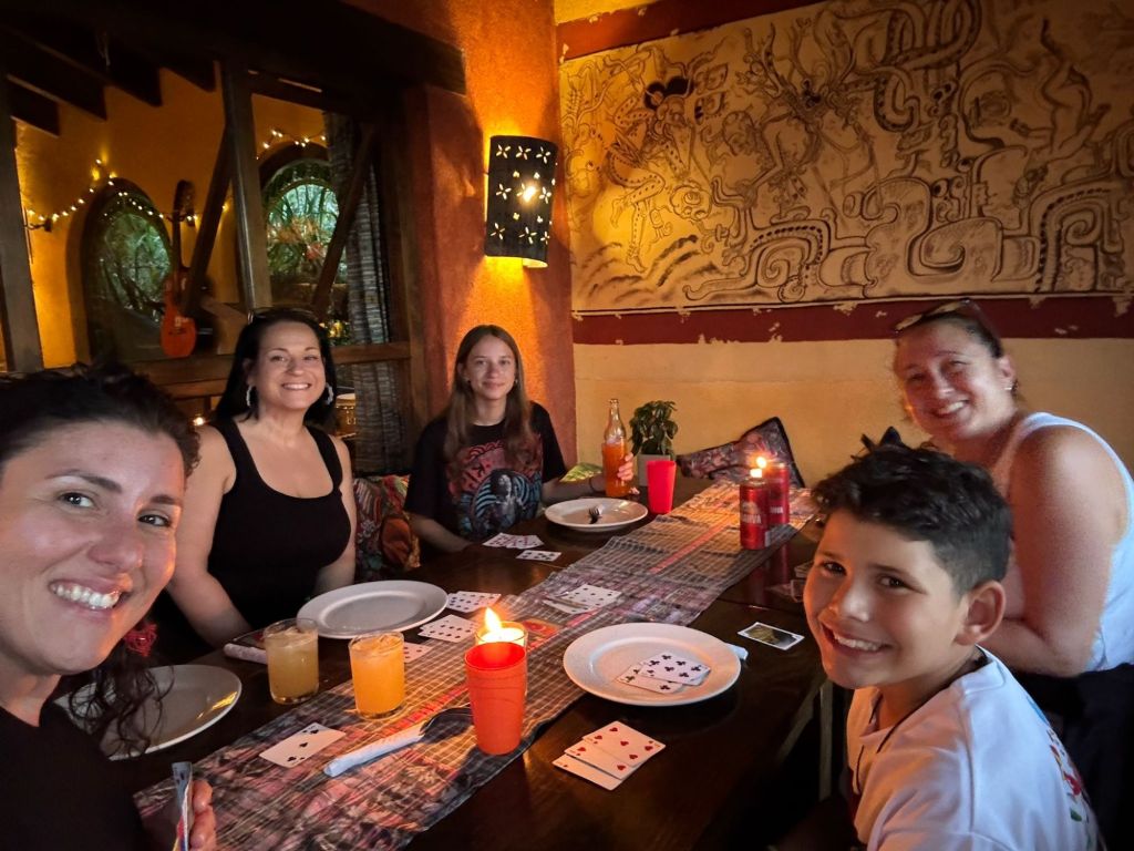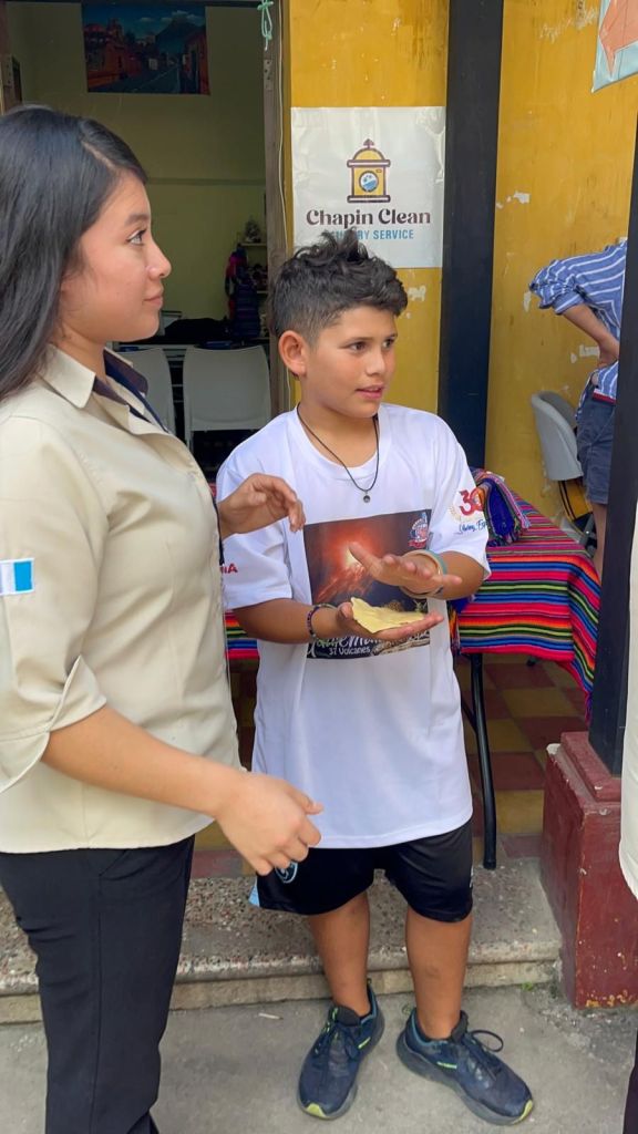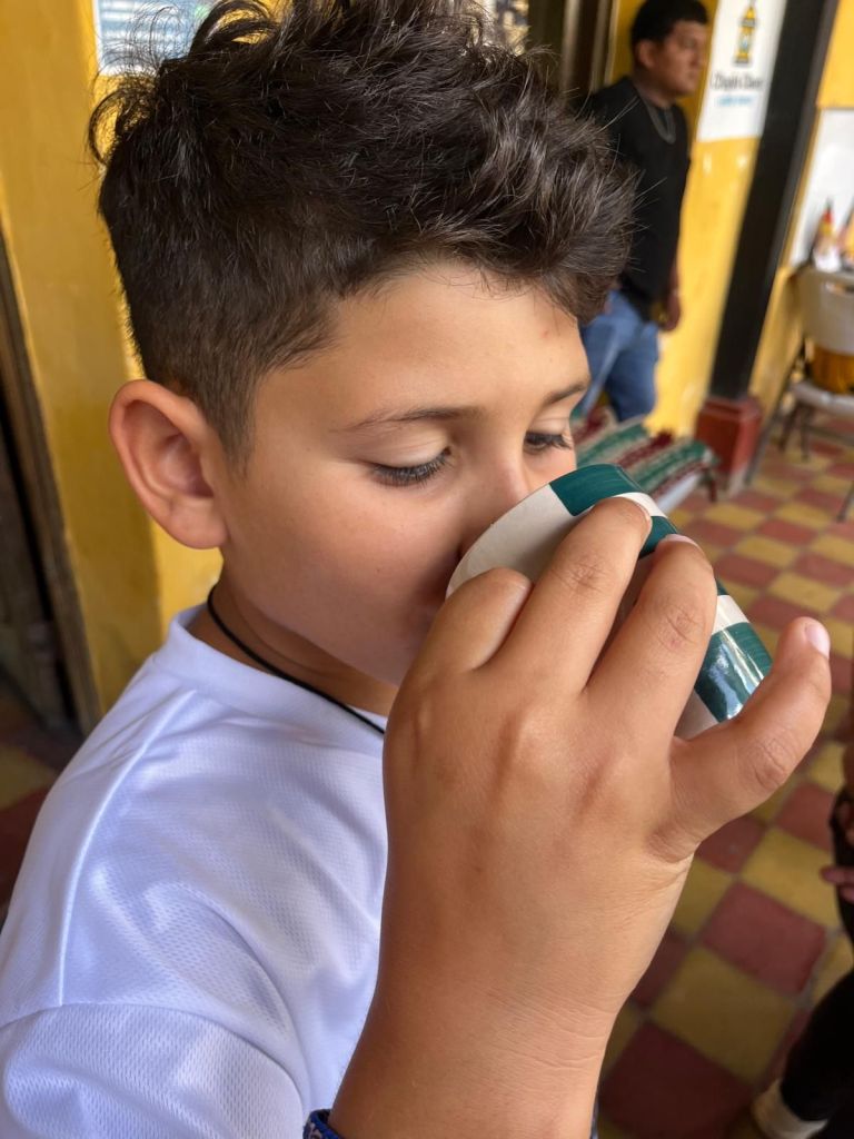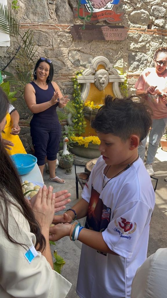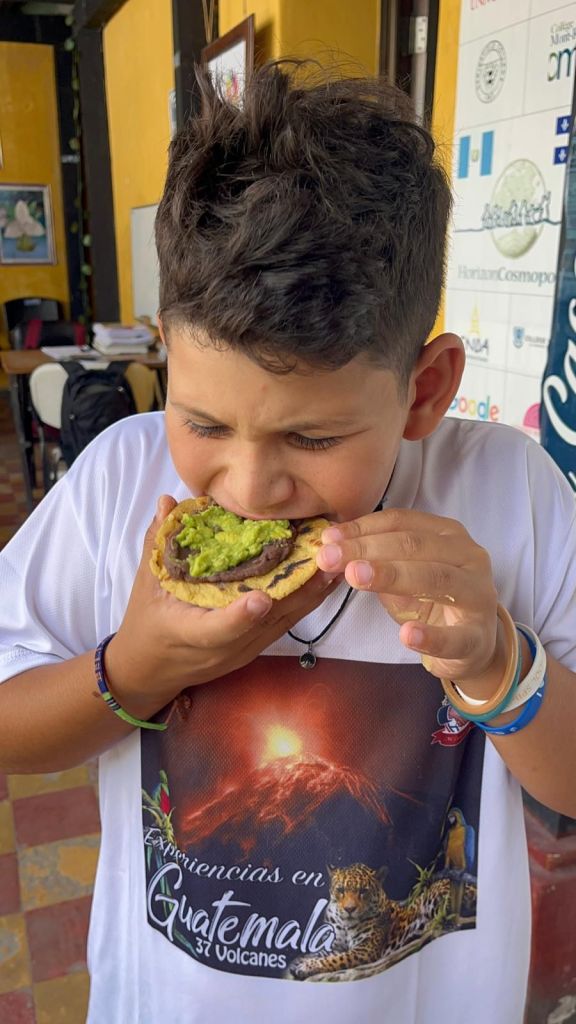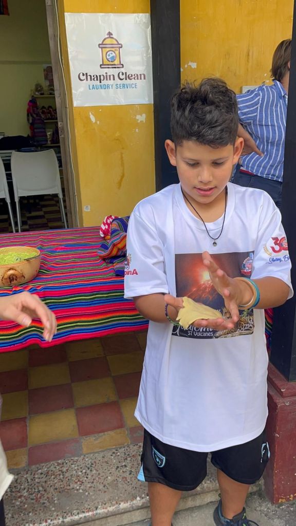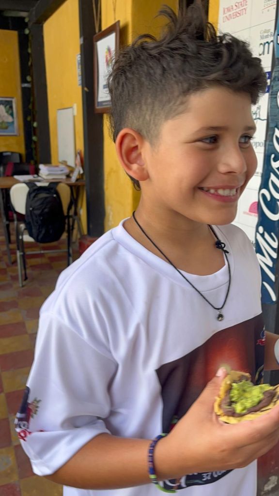Today was the most important day of Spanish school. I had a presentation about chips and salsa. But first I woke up at 6:45am and had cereal for breakfast. We walked to school and first we learned about feelings first and then we had to make the salsa. It was a Guatemala’s salsa called Guatemalteca. We had to cook the tomatoes until the skin was black and soft. Once all the tomatoes were black and soft we crushed them into small pieces and then we did it again and again and again. The rest of the ingredients for the salsa was cilantro, red onion, and lime. Once it was all finished it looked so good to eat with the chips. Then it was time for the presentation. Everyone in our family participated but not Mommy because she already knows Spanish. I went first. My voice was super nervous and I was about to stop but I pushed through it and once I finished I was so happy I got it over with. Then it was Ms. Christine’s turn and hers was so funny 😂. Then it was Tia’s turn. For some reason all the adults had a lot of words to say and including Tia. She did super good and all of us did super good. When everyone went the most favorite thing of all that I loved was chips and radish salsa!!!! That was so good! Then I got back to learning in school and I played a bunch of games with my teacher. Once I was finished with school we walked home and ate lunch. Then we chilled and then at 4 o’clock we walked to salsa lessons and I brought my word search because it was too advanced for me. Once we finished we ate dinner at the most fanciest restaurant in town and we had the best view because we had a light show where the projector projected really good stuff on the ruins. I talked to grandma and she just wanted to say that I did good at the presentation. Then we walked home and took a shower and went straight to bed because I was so tired.